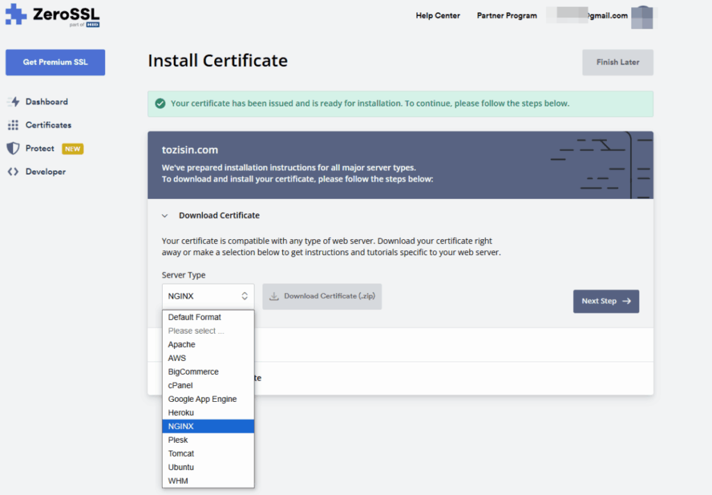 인증이 완료되면 인증서 파일을 다운로드 받은 후 서버에 인증서 설치 작업을 진행합니다.